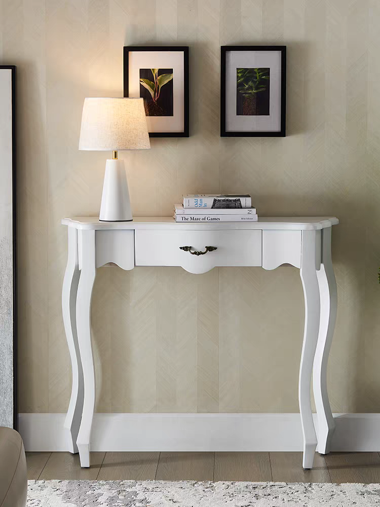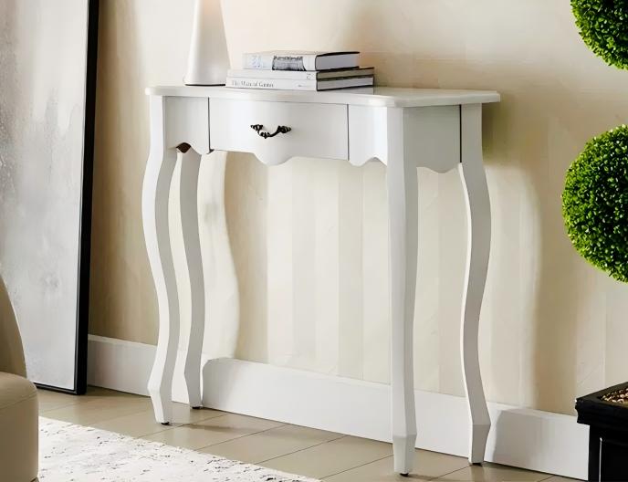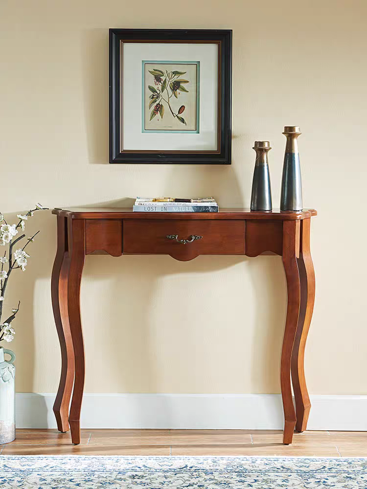 Gracefully curved cabriole legs and ornate apron detailing evoke timeless French elegance, bringing a touch of Parisian sophistication to your home. Meticulously crafted from solid wood with a rich walnut brown finish, this console showcases exceptional craftsmanship and enduring quality. The single drawer, adorned with decorative hardware, offers convenient storage for keys, mail, or small accessories while maintaining a refined aesthetic. Its narrow profile makes it ideal for entryways, hallways, or behind sofas—adding character and charm without cluttering your space. A perfect blend of form and function that transforms any room into an elegant statement.